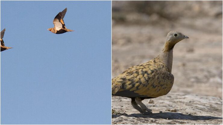 La ganga ortega è un modello di adattamento agli ambienti aridi. Più facile da udire che da vedere, porta colori ocra, grigi e crema, con inconfondibile ventre nero e un collare sul petto che la rendono invisibile sui lappi pietrosi. In volo, però, rivela una figura compatta e aerodinamica. Copre fino a 50 chilometri al giorno a 60-65 km/h per raggiungere acqua e cibo, spostandosi soprattutto all’alba e al tramonto. Le zampe, corte e robuste, la aiutano a camminare su terreni duri e a scovare tra le pietre i semi di cui si nutre.