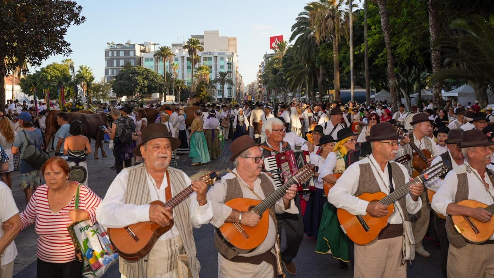 Una volta infatti, la sfilata ha lasciato Santa Catalina, ha intrapreso un cammino non affrettato, guidato da una rappresentanza delle otto isole e dal carro del comune. Seguita da moltissimi gruppi folkloristici, la processione ha incantato visitatori e residenti, mostrando la ricchezza culturale locale. Le formazioni musicali, come il Gruppo Amigos de la Orden de Cachorro Canario, hanno intrattenuto la folla con un vasto repertorio di canzoni, contribuendo all’atmosfera festosa dell’intera manifestazione.